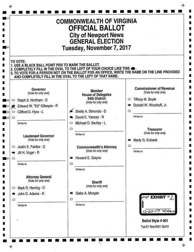 As for your assertion that overvotes are "ALWAYS summarily tossed" it's becoming clearer that you haven't a clue about Virginia law. Under Virginia law, ballots marked for two candidates are presumptively treated as invalid overvotes but that conclusion can be challenged during a recount. There are detailed specifications as to when a ballot that is marked for more than one candidate should and should not be counted. Simmonds lawyers presented a very strong case that, under those specifications, the ballot shouldn't have counted. The judges, without giving serious consideration to those arguments, decided that it should be counted.