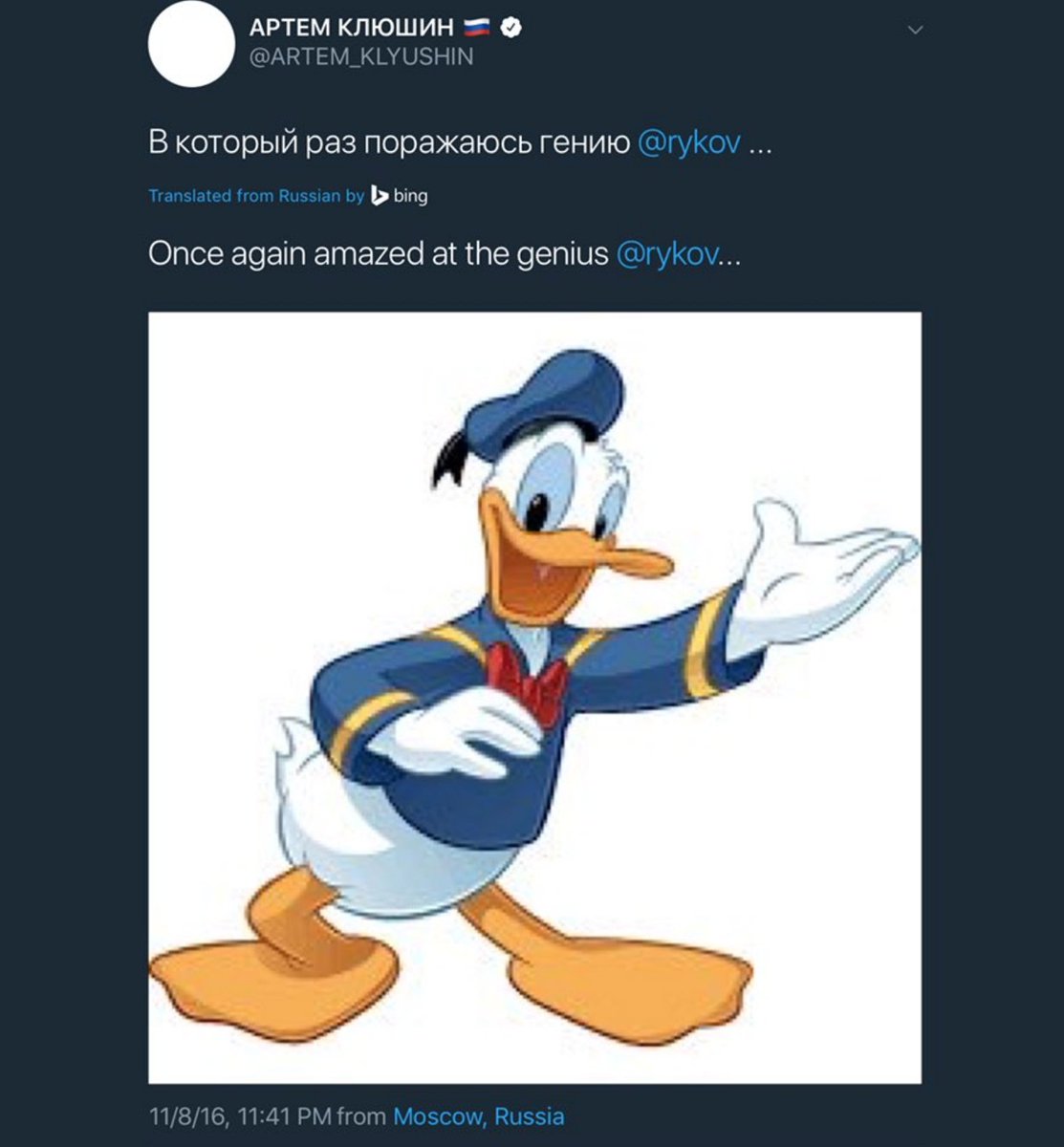 On September 28, 2017, Artem Klyushin tweeted, "Без моего вмешательства Трамп бы не победил."