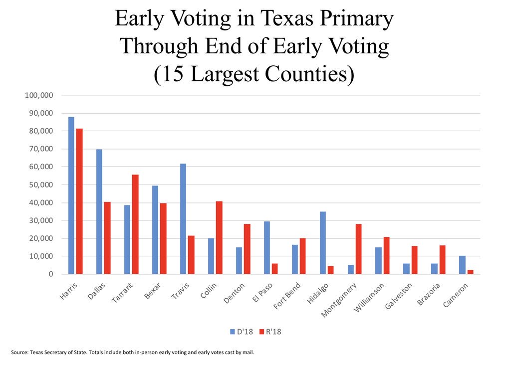 Democrats end early voting in Texas with 52.5% of the primary vote in the 15 largest counties. (Original Post)