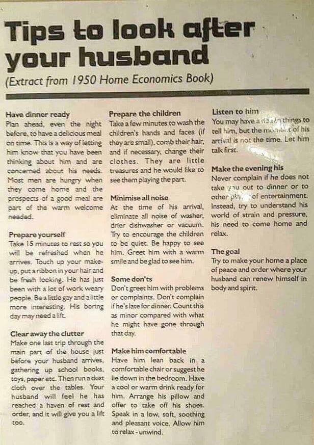 Related: Editorials & Other Articles, Issue Forums, Alliance Forums, Region ForumsTips to Look After Your Husband (1950s)