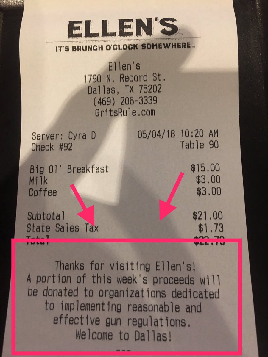 "Thanks for visiting Ellen's! A portion of this week's proceeds will be donated to organizations dedicated to implementing reasonable and effective gun regulations. Welcome to Dallas!"