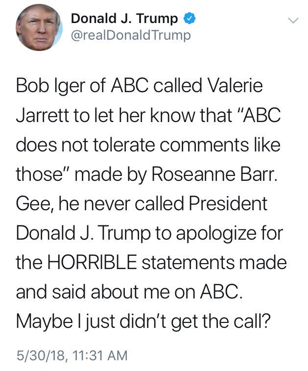 Wasn't the story yesterday that he was too busy working on North Korea to do Roseanne takes? (Original Post) kpete May 2018 OP