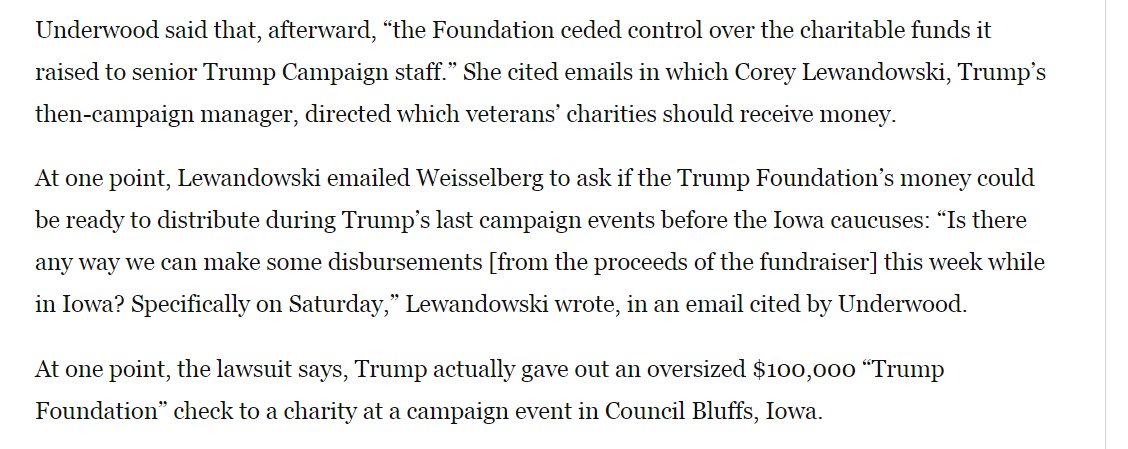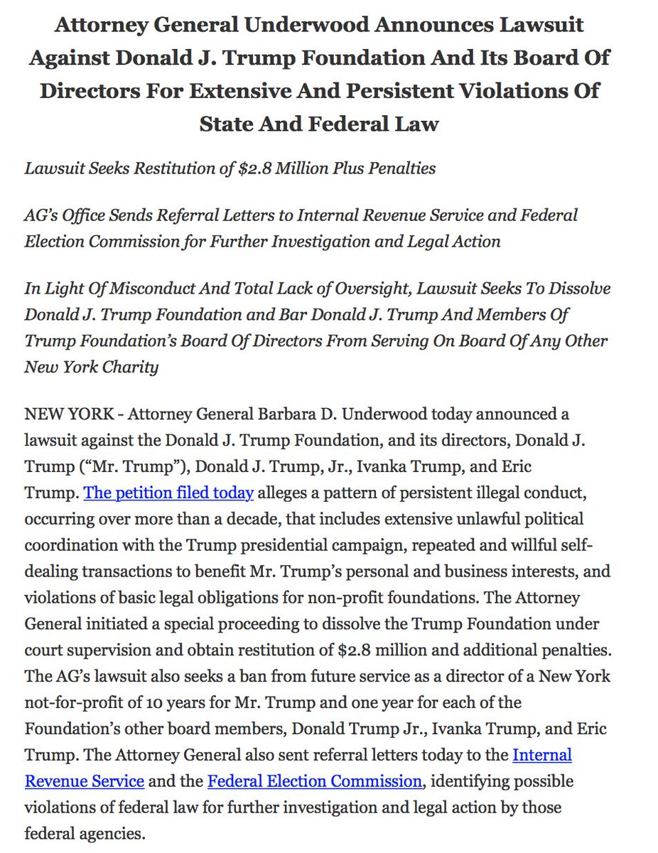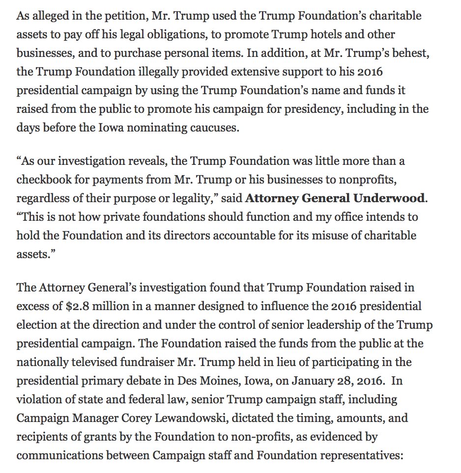 "The Attorney Generals investigation found that Trump Foundation raised in excess of $2.8 million in a manner designed to influence the 2016 presidential election at the direction and under the control of senior leadership of the Trump pres. campaign." https://t.co/9JvRd4GA0c