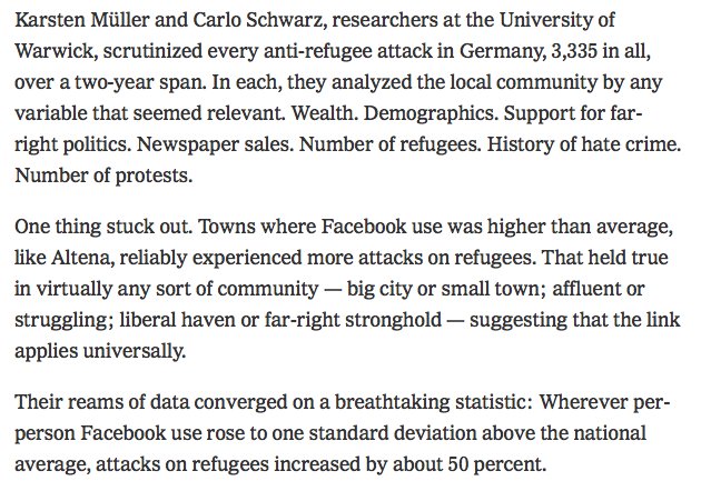 “[German] towns where Facebook use was higher than average, like Altena, reliably experienced more attacks on refugees. That held true in virtually any sort of community—big city or small town; affluent or struggling; liberal haven or far-right stronghold.”