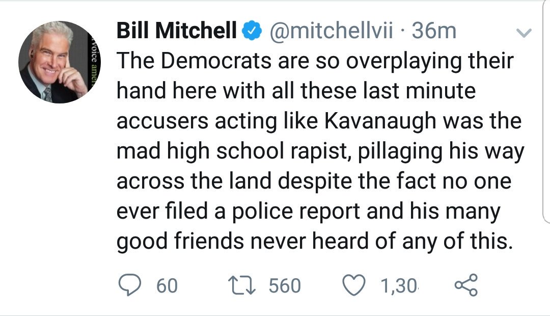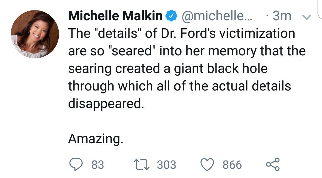 (34,747 posts)"She is afraid to fly, but look! She flew out here! She is such a liar!" I guess they don't understand that some people will do things even though they're afraid to do them. It's kind of ironic that Mitchell even brought up Dr. Ford's fear of flying. The only reason she is there is that a bunch of nasty, old men are too afraid to question Dr. Ford themselves.