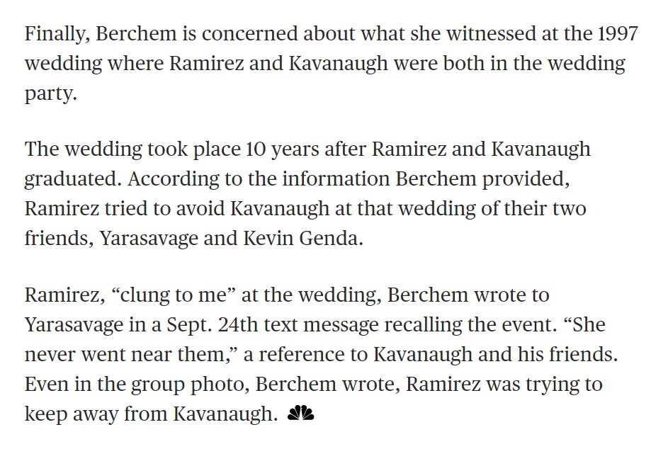 Kavanaugh tried to obtain a photograph at a 1997 wedding "in order to show himself smiling alongside Ramirez 10 years after they graduated."Text messages between those Yale classmates reveal Ramirez was desperate to avoid Kav at the wedding👇