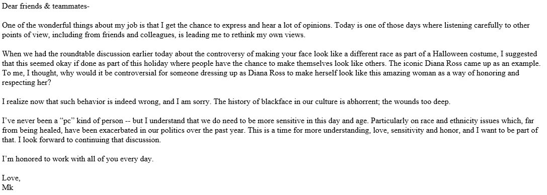Related: Editorials & Other Articles, Issue Forums, Alliance Forums, Region ForumsHere's the email Megyn Kelly sent to colleagues today apologizing for her comments on blackface
