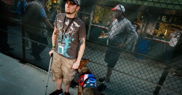 Iraq veteran and PTSD sufferer Brad Schwarz attends a Cubs game in Chicago on June 14 with his service dog, Panzer, and a group of veterans from the Wounded Warrior Project. (Photo by Scott Olson/Getty Images)