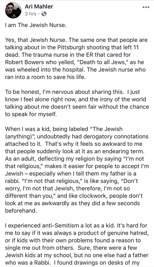 Love. Thats why I did it.The Jewish nurse who treated the alleged Pittsburgh synagogue killer broke his silence in a Facebook post, tonight. Ari Mahler says the suspected mass shooter thanked him for the care, and likely had no idea Mahler was Jewish.