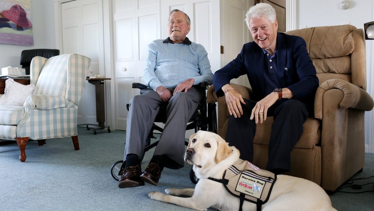 KENNEBUNKPORT, Maine - The 94-year-old and his new companion, named Sully, got acquainted Monday at the Bush family compound on the coast of Maine. A photo sent via Twitter shows Sully lounging at the feet of Bush and former President Bill Clinton, who had been visiting on Monday. (DU post)
