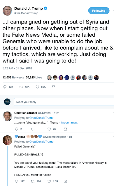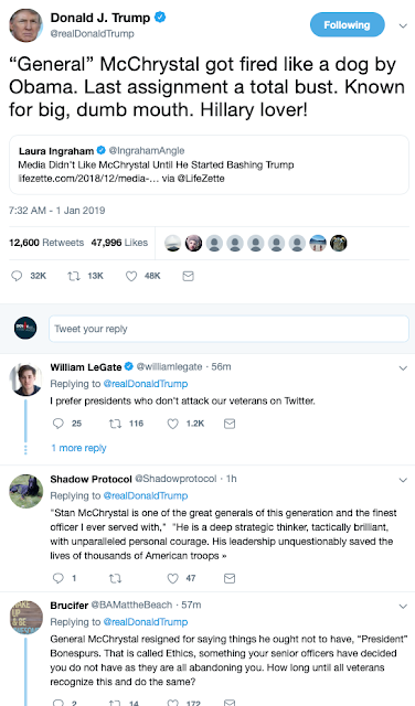 is that few outside the administration want the job of replacing Jim Mattis as defense secretary, given the presidents decision to yank American troops out of Syria and other recent moves." The other day retired 4-star General Stanley McChristal explained why he wouldn't work for Trump. It just took Cadet Bonespurs a matter of hours-- and a few snorts of chopped-up Adderall-- to lash back like a rabid dog:
