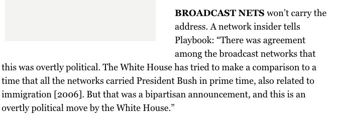 Here is the full anonymous quote from a network executive justifying their refusal to air President Obama's Nov 2014 address for fear it would have been "overtly political." https://www.politico.com/tipsheets/play