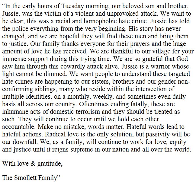 "Jussie has told the police everything from the very beginning. His story has never changed, and we are hopeful they will find these men and bring them to justice."
