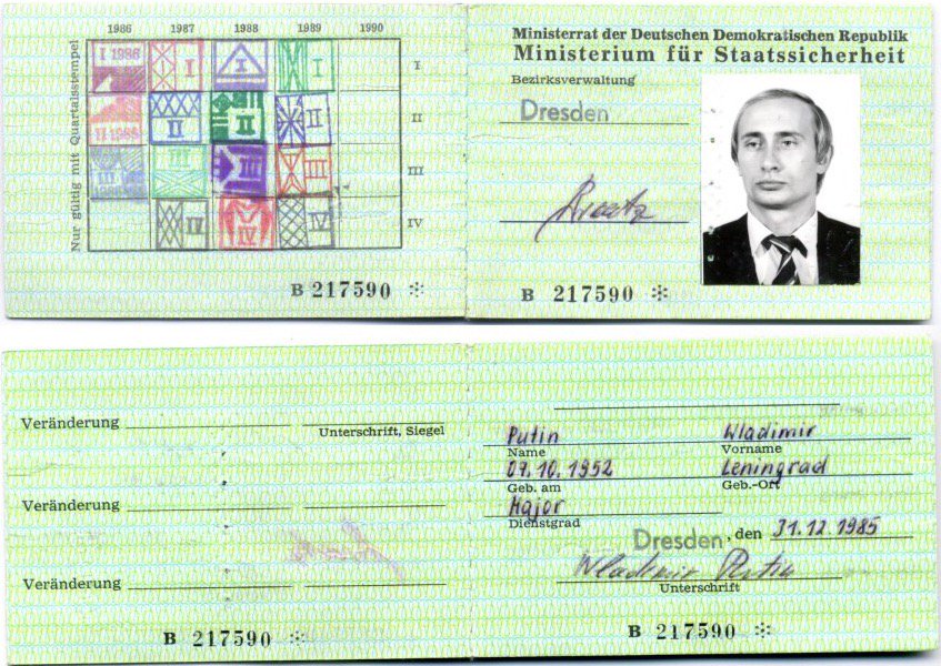 Issued in 1985, the document belonged to the then mid-ranking Soviet officer, now the President of Russia. At the time, Putin worked for the KGB spy service as a liaison with the East German State Security Service (Staatssicherheitsdienst), nicknamed the "Stasi."