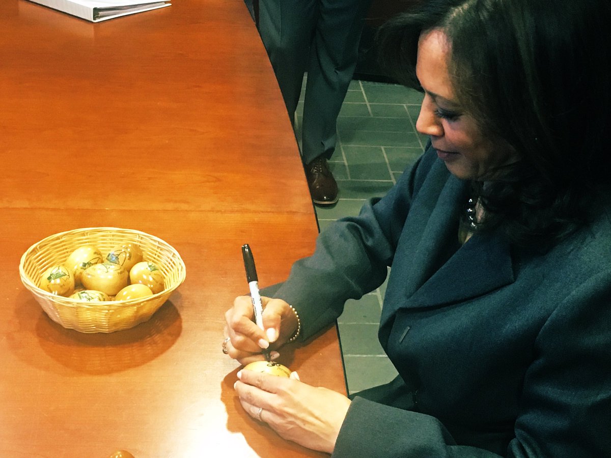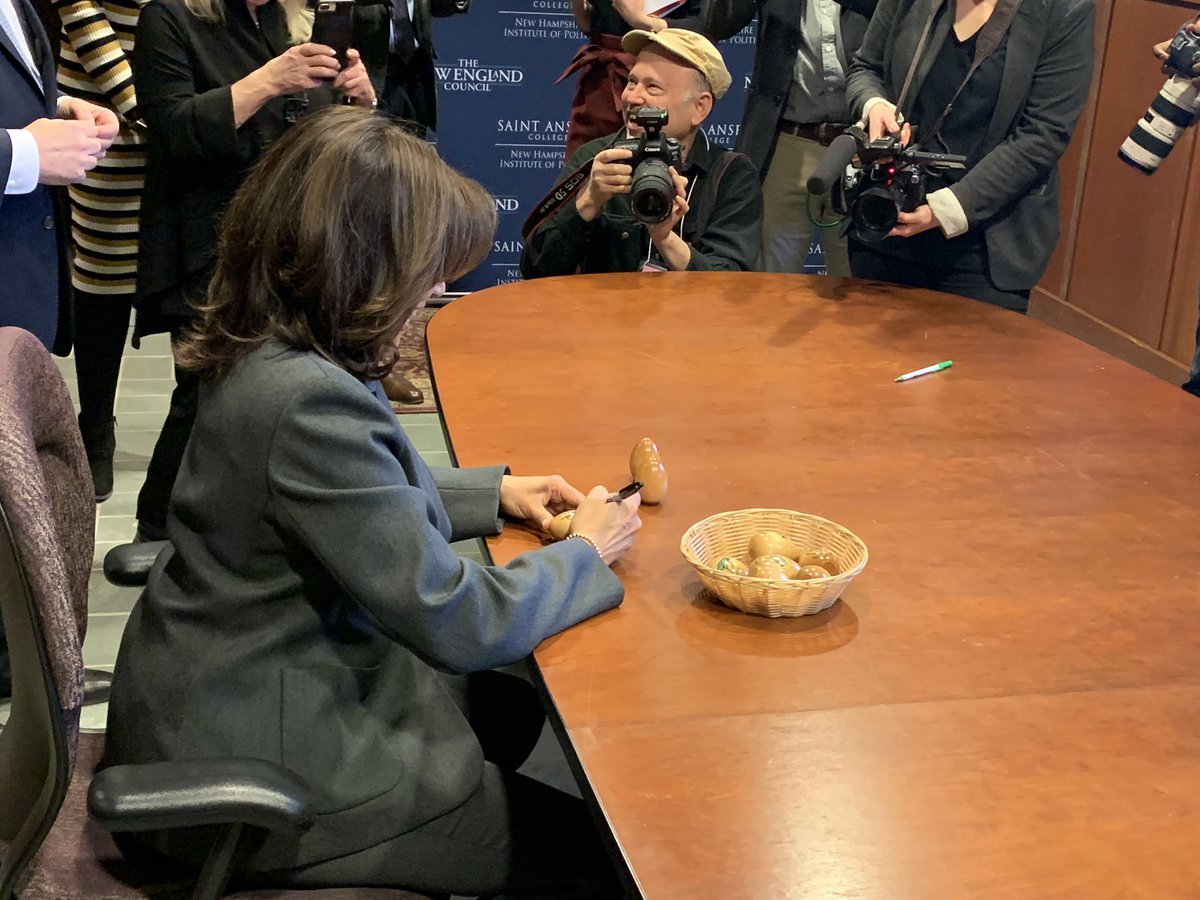 Senator @KamalaHarris is taking part in a New Hampshire tradition: signing the eggs at Politics & Eggs. #fitn #nhpolitcs