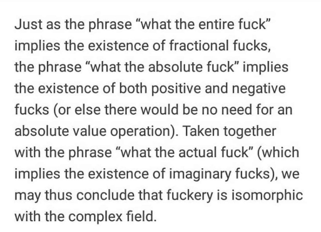 (12,651 posts)To claim fuckery is isomorphic to the complex field. What are the identity elements? Is it associative? Is it closed under the two operations? Etc.