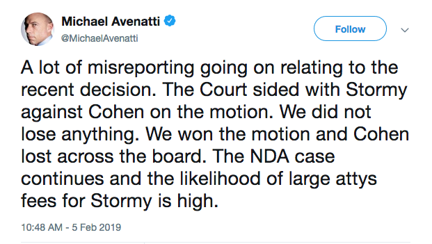 Like most of his losses so far, you can bet that Avenatti will be calling this one some kind of "victory". He was promising that the damages in the contract action would exceed the fees of $300k already awarded against her. If the defendants want to keep going in the state court, which is a questionable proposition whether anyone actually can, then it's simply a question of whether she goes $130k deeper into the hole.