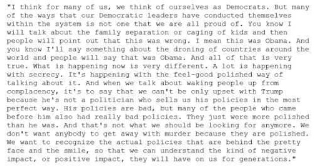 Omar says. And thats not what we should be looking for anymore. We dont want anybody to get away with murder because they are polished. We want to recognize the actual policies that are behind the pretty face and the smile.
