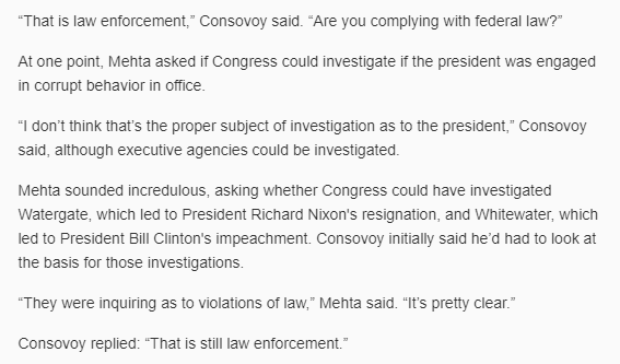 President Trump's lawyers told a judge today that Congress didn't have the power to investigate him for corruption, and suggested that both the Whitewater and Watergate investigations were invalid attempts at "law enforcement." (link: https://www.usatoday.com/story/news/politics/2019/05/14/president-trump-fight-congressional-subpoena-financial-records-mazars-court-hearing/1187746001/) usatoday.com/story/news/pol