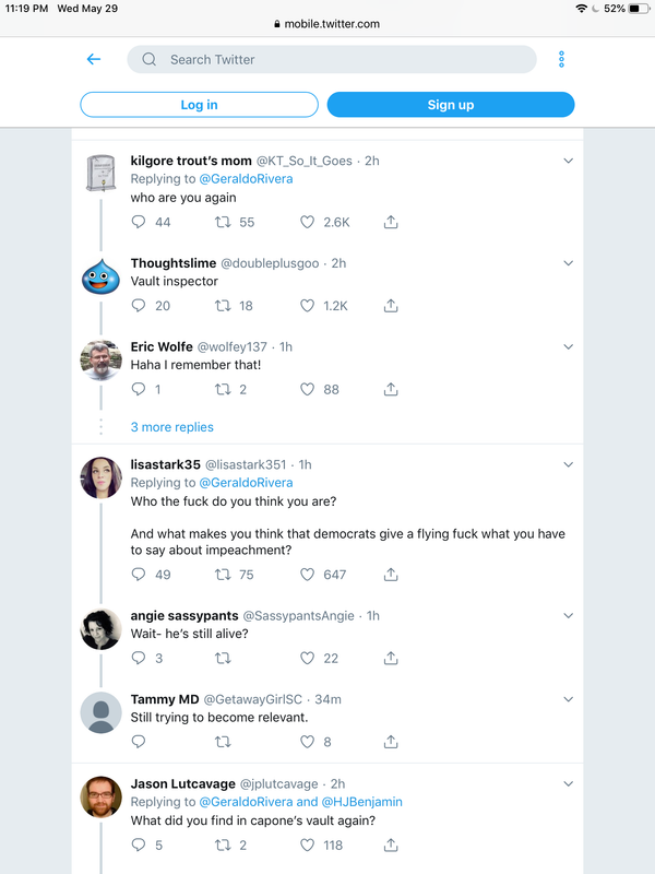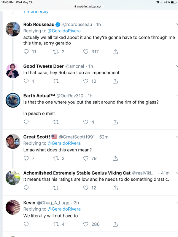 (129,729 posts)"Folks, I've got some bad news. We've been getting closer to starting an impeachment process. We've been winning in the courts; we'll get the witness testimony and the documents before long, and after Mueller's statement Nancy seemed to be changing her mind. But Geraldo Rivera has just tweeted this: "I tonight announce that if you want to impeach this president on these facts you'll have to come through me.""
