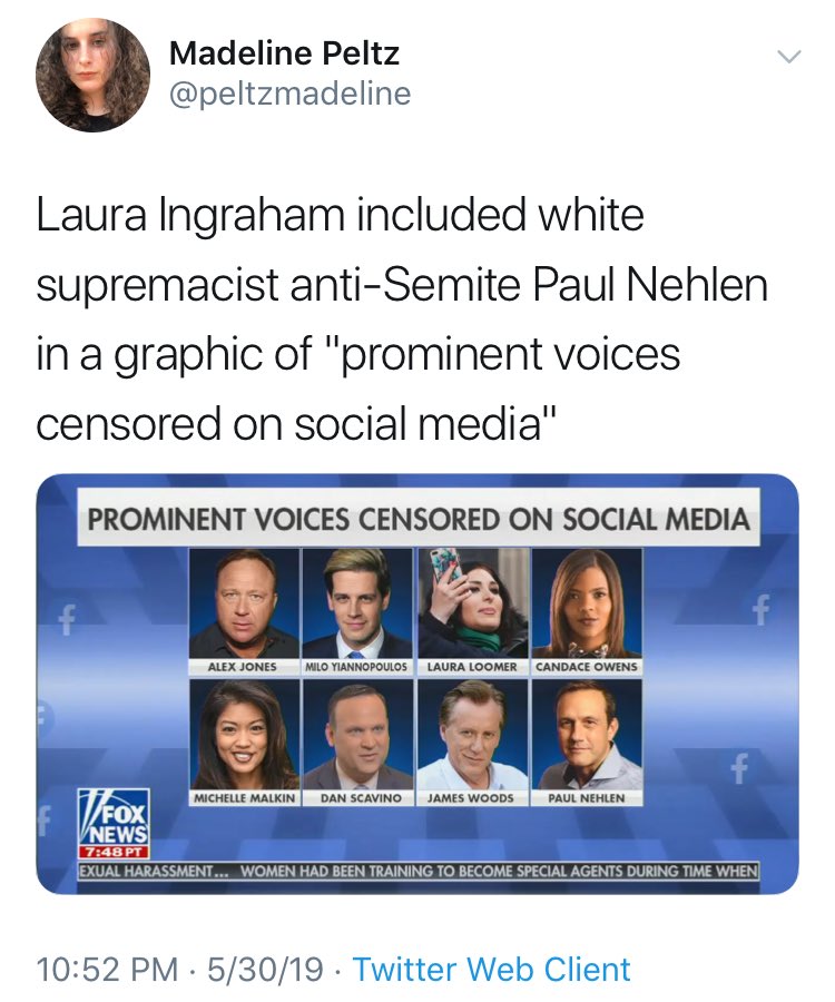 Fox News host Laura Ingraham appeared to defend the white supremacist Paul Nehlen during her show on Thursday night in a segment with conservative activist Candace Owens during which the pair discussed social media bans of prominent right-wing figures.