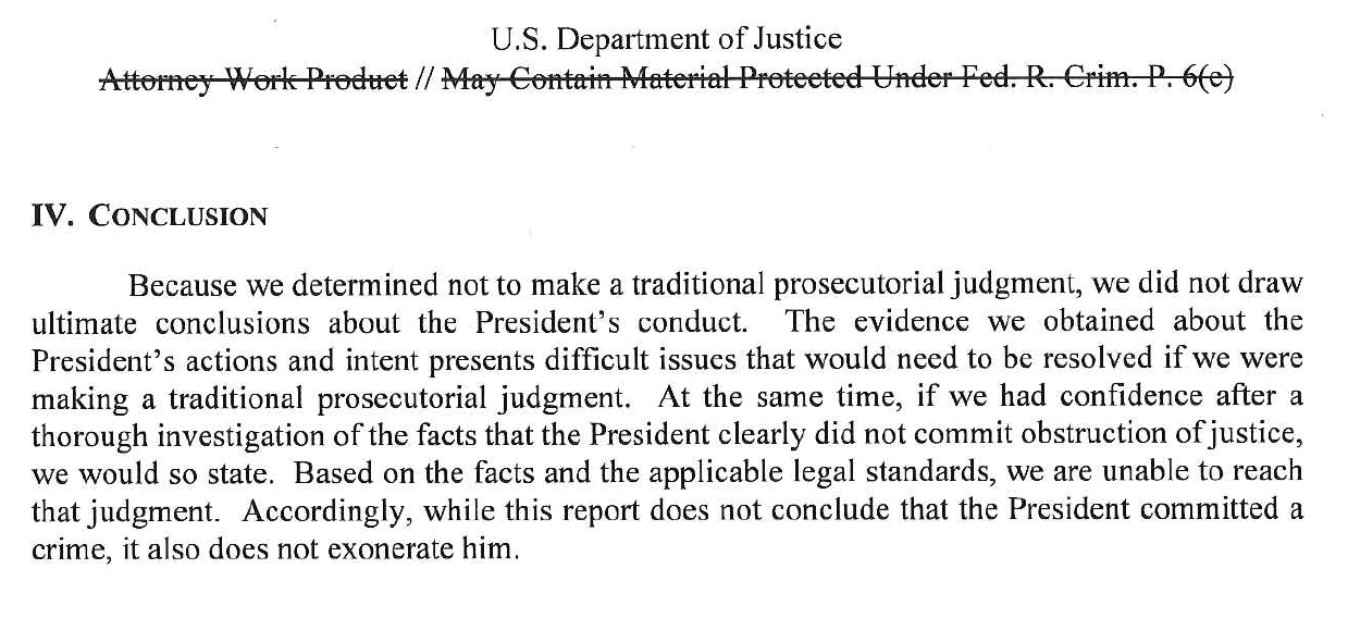 "The Special Counsel states that while this report does not conclude that the President committed a crime, it also does not exonerate him."