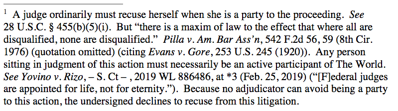 (129,736 posts)I used to have a whole collection of court opinions addressing bizarre pro se lawsuits brought by people who were pro se for good reason - wish I could find it. A couple of my favorites that I can remember are Mayo v. Satan, here: https://kevinunderhill.typepad.com/Documents/Mayo_v_Satan.pdf (lawsuit against Satan dismissed for lack of personal jurisdiction) --