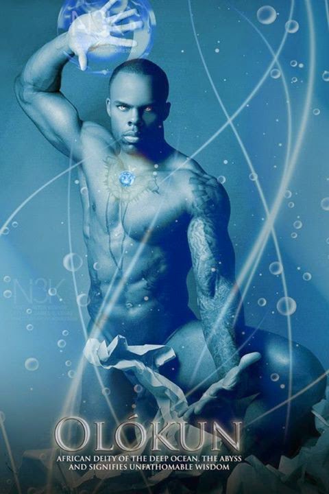 Olokun, orisha of wealth and the deep sea who is androgynous, depicted as female or male. I love the male depiction because there are so few imagery of mermen.