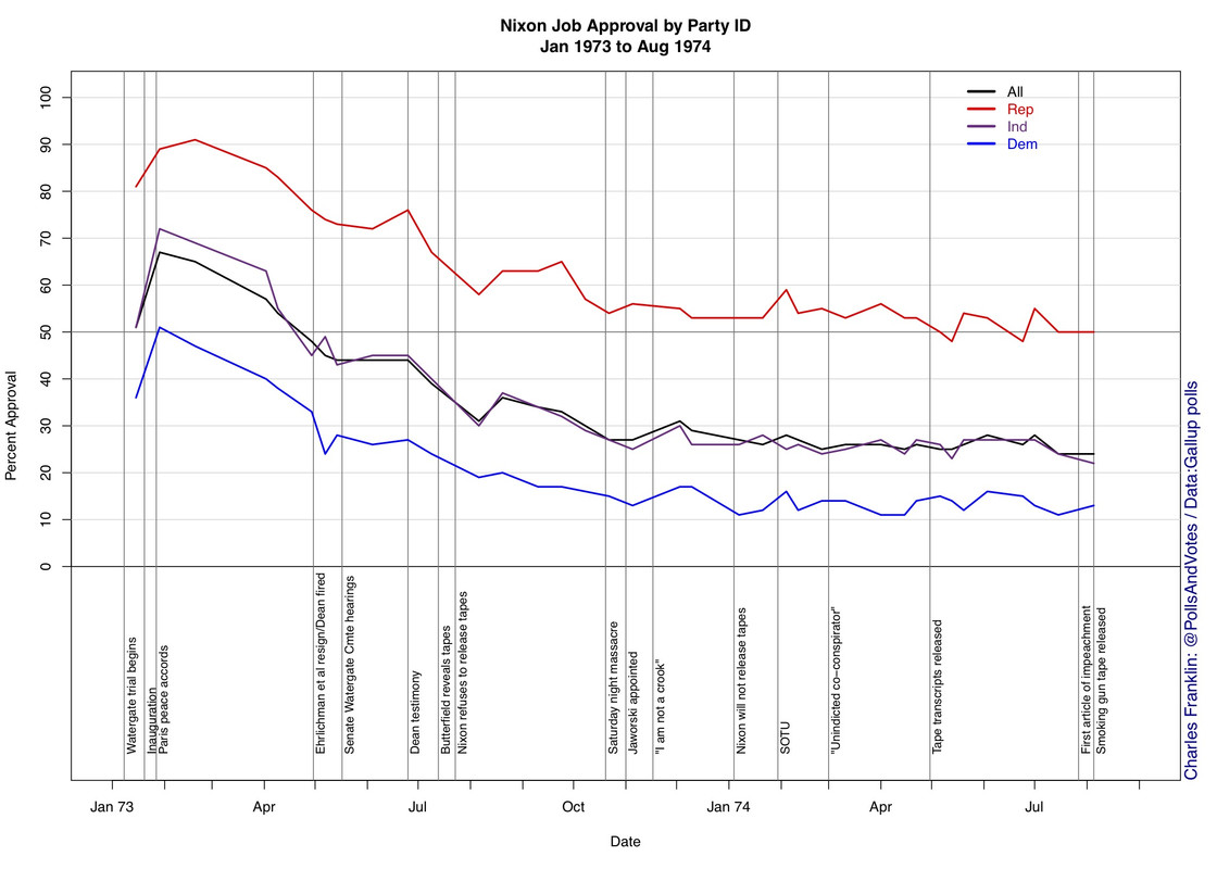 (129,726 posts)It wasn't until the summer of 1974 and the release of the tapes that a critical mass of GOPers finally realized that Nixon had become unpopular enough that they could no longer afford to support him. But even after he resigned, about 24% of the electorate still supported him.