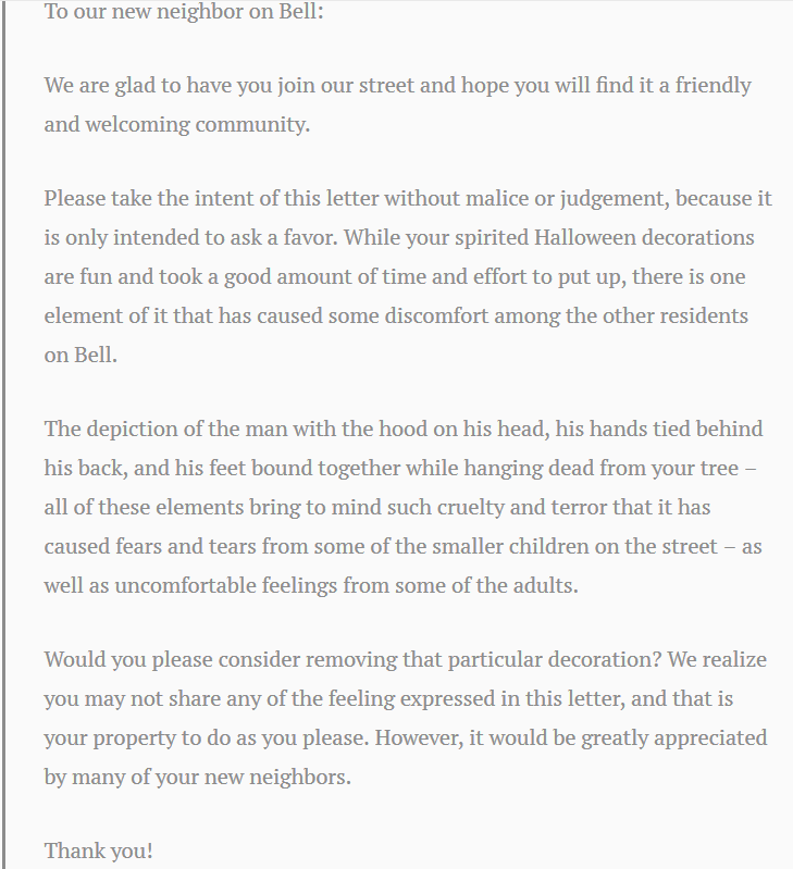 The letter he splattered with fake blood and is holding up is the letter that neighbors sent him, politely asking him to take the "display" down: