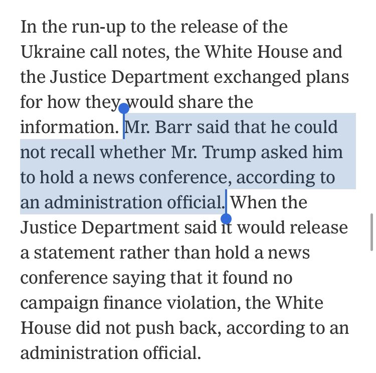 Interesting new detail in this latest from NYT on Trump-Barr tension. Admin seems to be beta testing a defense of Barr could not recall Trump asking him for presser. Kinda soft, given Trumps forceful denial, & seems to address a direct Trump-to-Barr ask, which was not reported