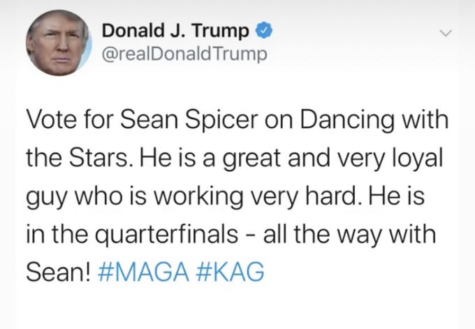 Although President Trumps former press secretary was demonstrably lacking in dance skills, he made it into the Top 6 of ABCs competition series, thanks to determined viewers votes. That is, until Monday night, when Spicer performed an Argentine tango to Destinys Childs Bills, Bills, Bills and a fox trot to One Directions Story of My Life. (The episode has a boy band and girl group theme.)