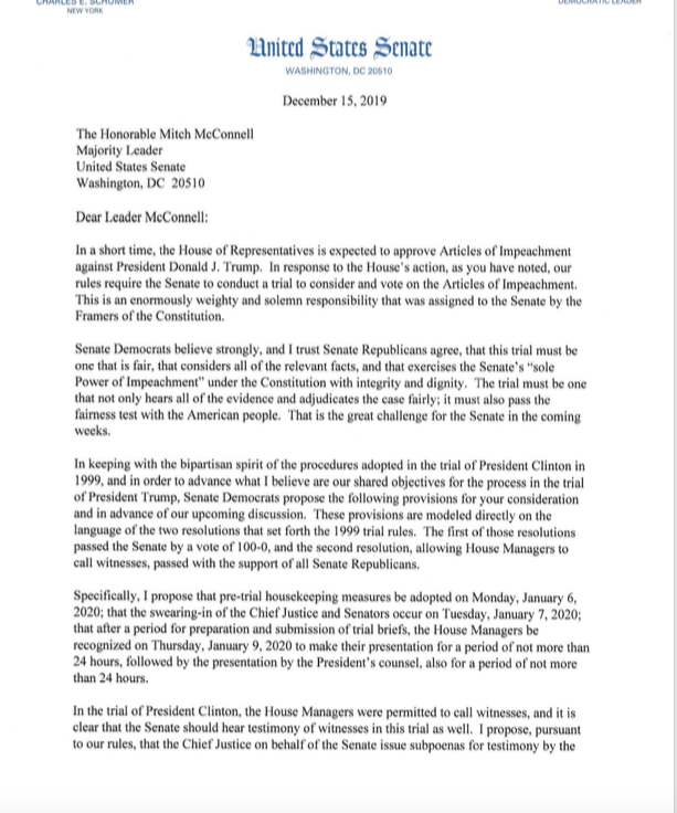 Related: Editorials & Other Articles, Issue Forums, Alliance Forums, Region ForumsSchumer sends letter to McConnell suggesting 4 witnesses and ground rules for impeachment trial