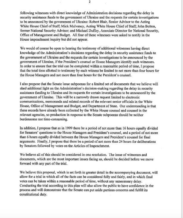 NEWS: Senate Democratic Leader Chuck Schumer sends letter to McConnell suggesting 4 witnesses and ground rules for upcoming impeachment trial. His witnesses include Mick Mulvaney, John Bolton. Michael Duffey and Robert Blair.