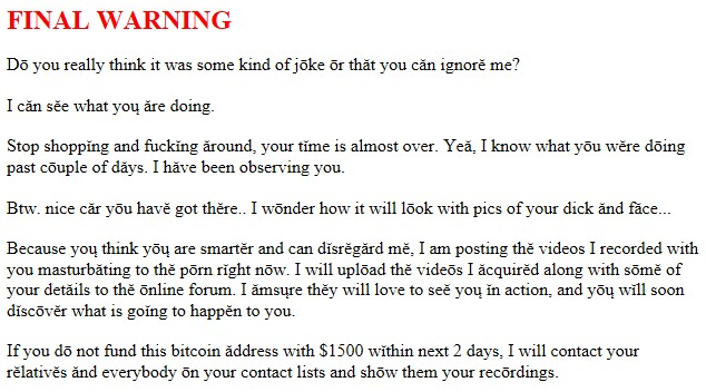 Anywho, the hook is that someone has infected your computer while you've been masturbating to porn on the internet, and they've recorded split screen video of what you were watching and what you were doing. They also have obtained all of your contacts, and will send the video to all of them if you don't send $1500 in bitcoin to a bitcoin wallet address which they provide.