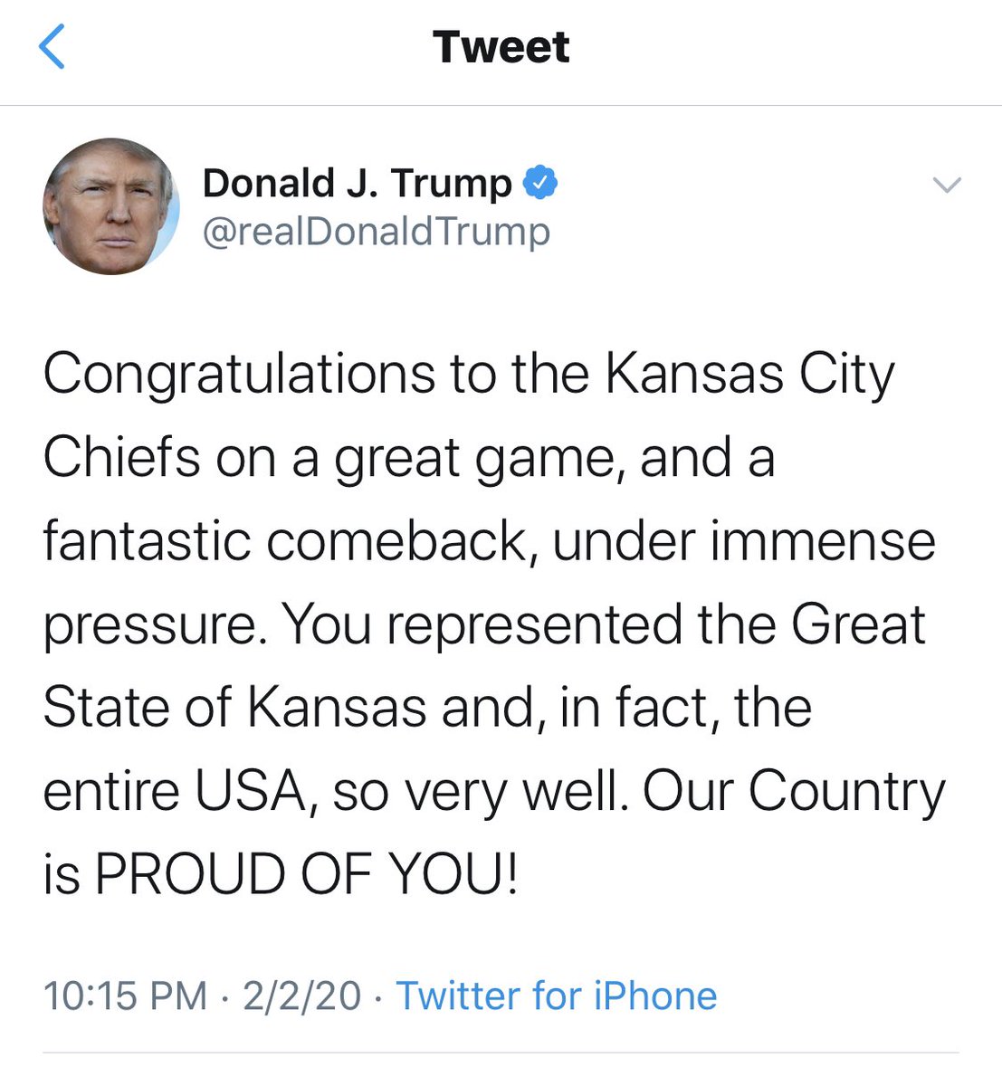 He offers congratulations to the Kansas City Chiefs for their Super Bowl win, Then mentions them representing the state of Kansas.