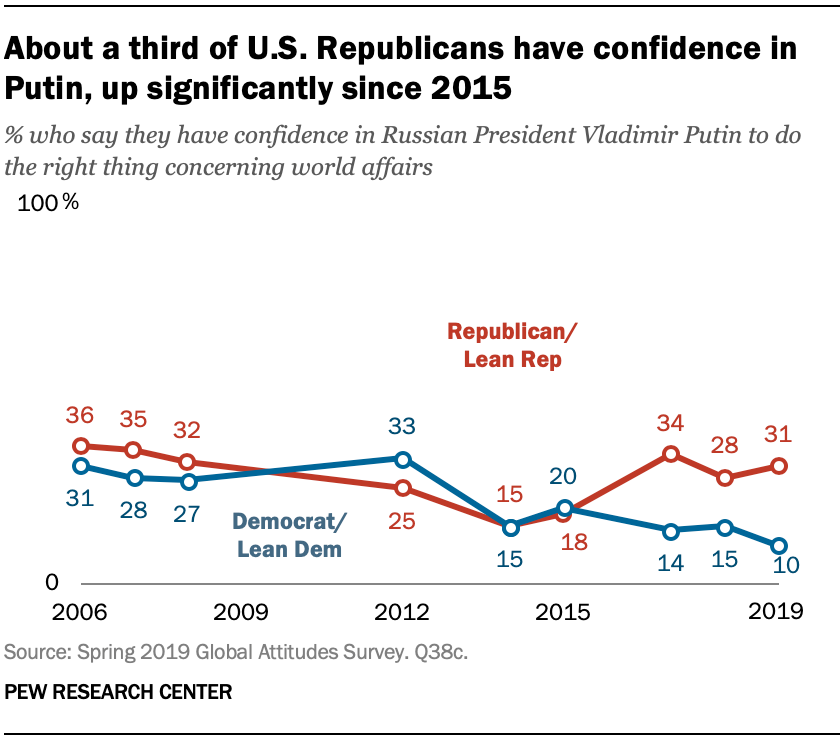 Americans consistently have expressed little confidence in Russian President Vladimir Putin. But Republicans are now 21 points more likely than Democrats to express confidence him (31% vs. 10%), the widest partisan gap in our polling. https://pewrsr.ch/375lQsC