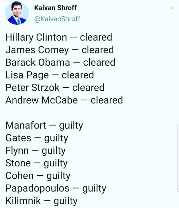 And yet, line-item by line-item, the original post is completely true. And these investigations were especially detailed. They were picking fly shit out of pepper and still couldn't fin anything truly actionable on the "cleared" in the OP. Yet, they found mountains of evidence on the "guilty".