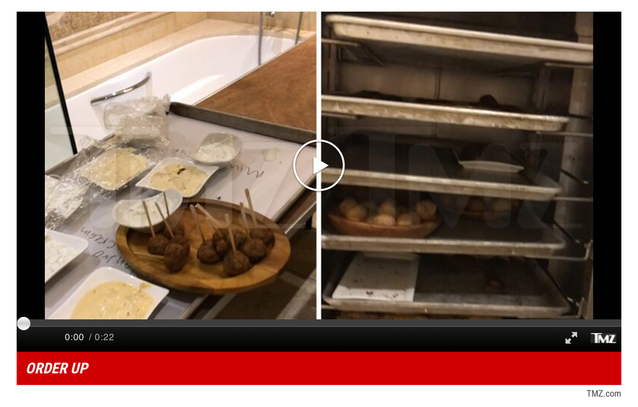 What's not clear ... what was food doing in the bathroom? You see some appetizer trays that appear to have already been passed around, so the leftovers could have simply been stored in the bathroom. But check out the food warmer. You see the light on, which means the oven is on, and you see trays of untouched empanadas and other hors d'oeuvres. We have repeatedly called the hotel for days, trying to find out if this was the staging area. So far, no response