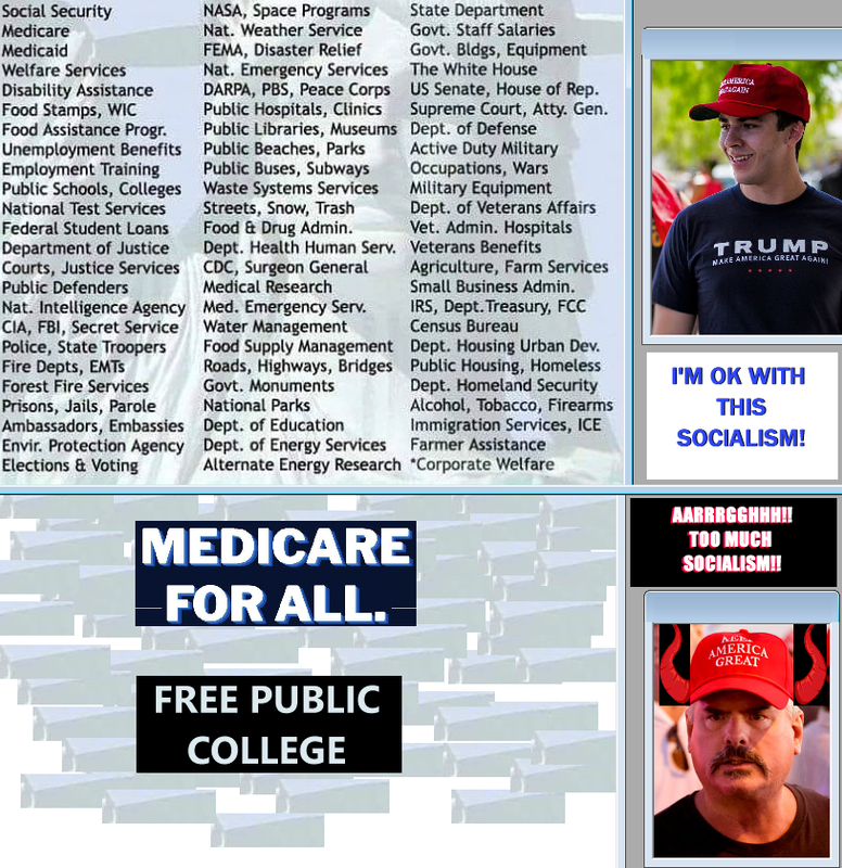 (1,944 posts)The Hypocrites who have no issue with socialist programs in general But for some reason have been taught to violently oppose a couple extra programs that would benefit them as well and instead they scream bloody murder that all socialism is evil.