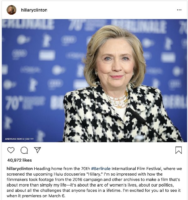 hillaryclinton Heading home from the 70th #Berlinale International Film Festival, where we screened the upcoming Hulu docuseries "Hillary." I'm so impressed with how the filmmakers took footage from the 2016 campaign and other archives to make a film that's about more than simply my life—it's about the arc of women’s lives, about our politics, and about all the challenges that anyone faces in a lifetime. I'm excited for you all to see it when it premieres on March 6.