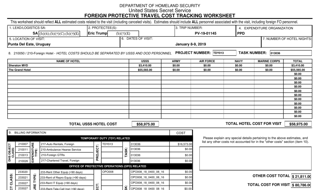 ERIC TRUMP'S 2019 BUSINESS TRIP TO URUGUAY COST TAXPAYERS $80K