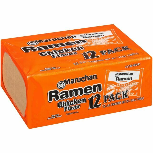 You can buy a 12 pack of Maruchan Ramen Noodle Soup, Chicken Flavor, 3 oz packages at Walmart for about $3.