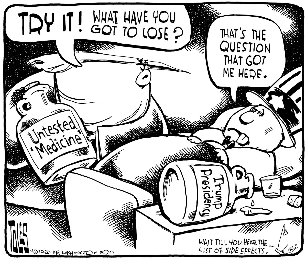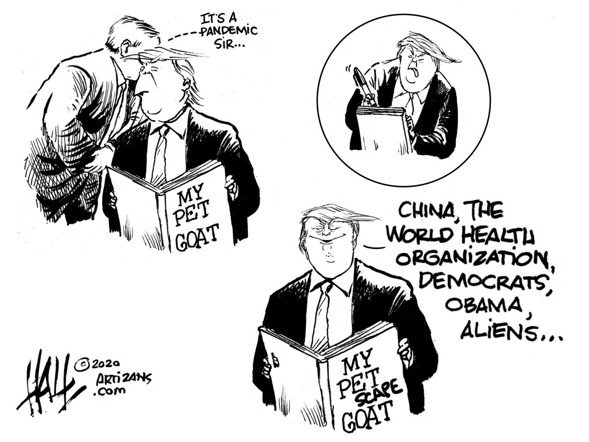 I have discovered that I can not laugh anymore, this whole situation is too heartbreaking. We have an absolute MORON missing a heart and soul in the WH. When will people wake up and see HIM for what he is? The words "Many a truth is spoken in jest" comes to mind with every cartoon. People are dying terrible deaths, while he only sees $$$ signs. I am beyond disgusted with this country.