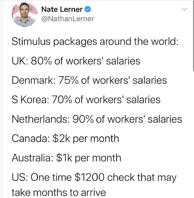 The citizens of those other countries have their robust stimulus money to drive their economies. Our plan is weak; it's too little and doesn't cover a long enough period of time to be effective either for the people or shoring up the economy.