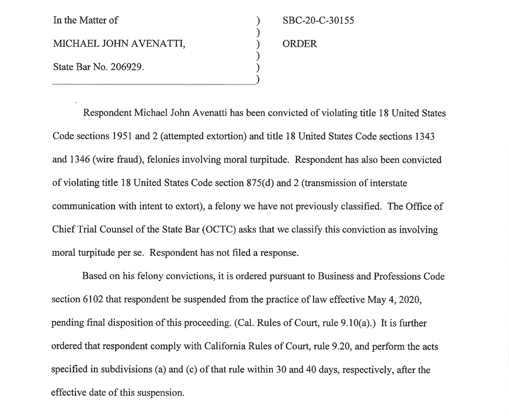 While he's been released with an ankle monitor for the time being, Michael Avenatti received further news this week from the State Bar of California.