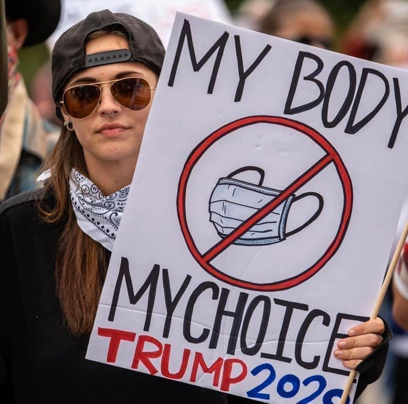 So here we have, never mind the president of the U.S. inciting violence (again), but his zombies demonstrating against Public Safety masks, and here you have this wingnut zombie woman changing the word Choice into her Body right. Fine. No mask, no distancing, and SHE will be INFECTED and will infect OTHERS. Fine, you go, girl! Probably one less LIVE vote for SHITLER in November.
