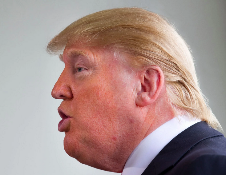 This image, however, is fake. Berger created it using a photograph that Getty Images photographer Matthew Cavanaugh took on 27 April 2011 in Portsmouth, New Hampshire. Berger flipped the original photograph, enlarged Trumps throat, and colored his skin a darker shade of peach. Heres a comparison between the genuine image (left) and the doctored image (right). We flipped the doctored image back to its original position for an easier comparison: