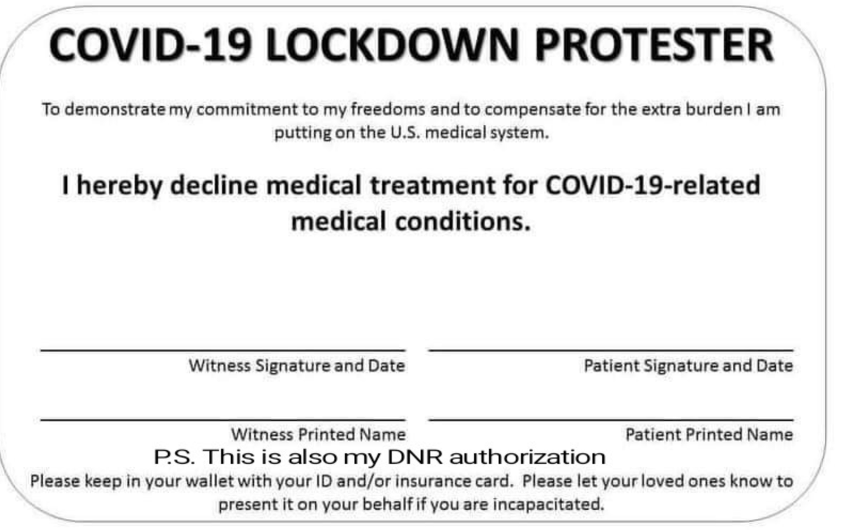 Anyone willing to protest the stay in place or shelter at home order needs to carry this card. Dont expect the hospital to save your ass for being stupid!