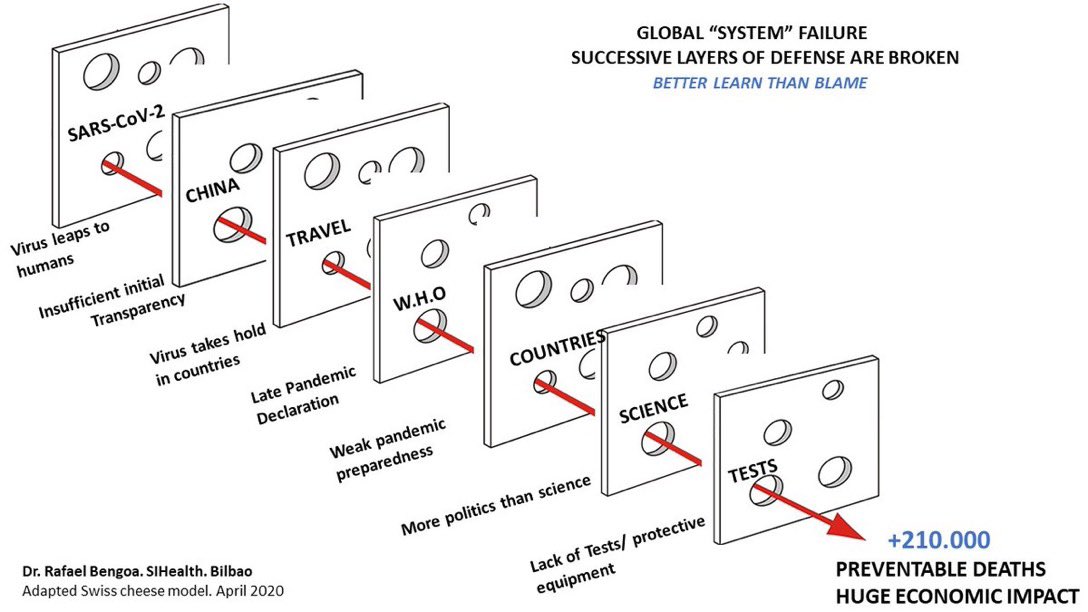 You have all these different slices of Swiss cheese lined up. All the holes are randomly placed. The slices are randomly selected. Each slice is 90 percent solid and 10 percent hole. The thing you're trying to prevent has a ten percent chance, upon encountering each slice, of getting past that slice.